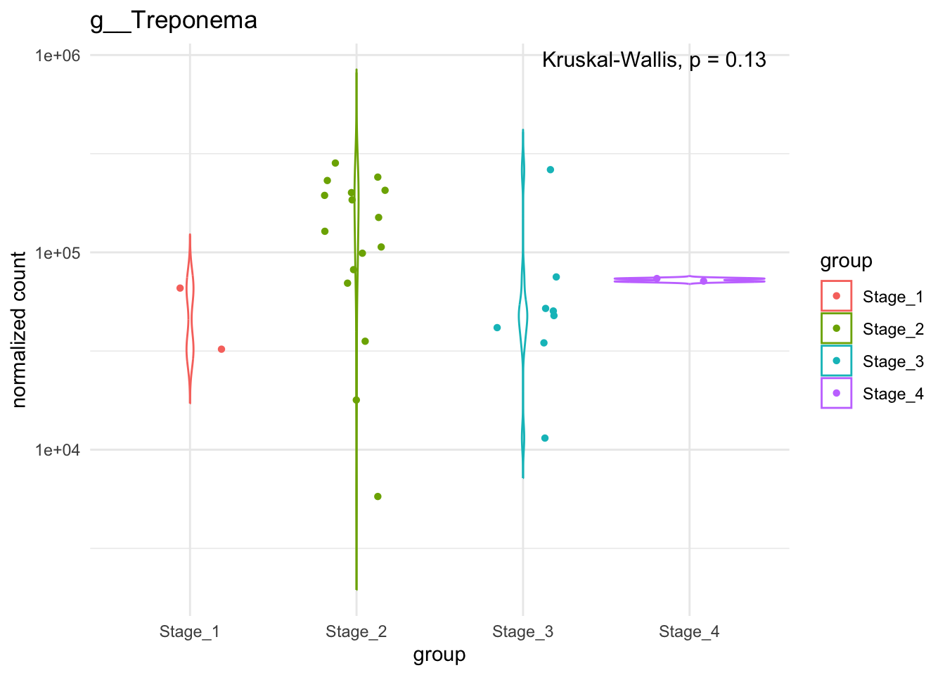 = plotCountsGGanysig(dds_stage, gene= "g__Treponema", intgroup = "noma_stage_on_admission", plot = "violin", text = FALSE, showSignificance = TRUE, sig_method = "kruskal") Trep_stage