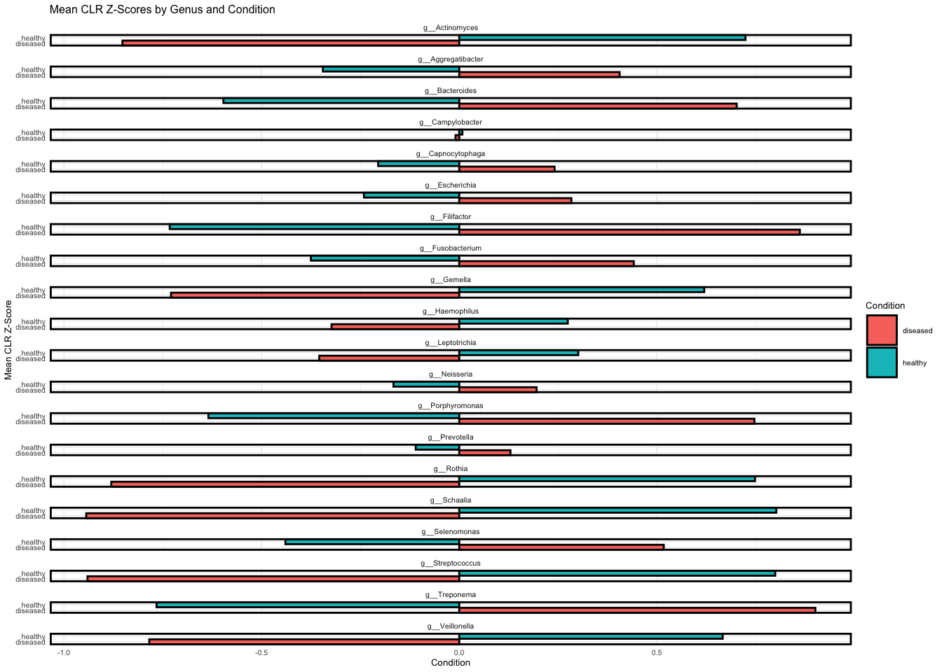labs(x = "Condition", y = "Mean CLR Z-Score", fill = "Condition", title = "Mean CLR Z-Scores by Genus and Condition") +