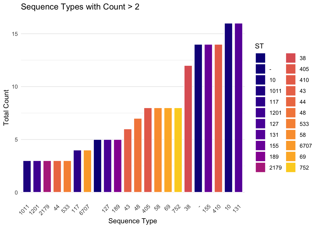 Now we will just plot the most abundant STs, here we will define it as any with a count above 2 (i.e. count > 2)